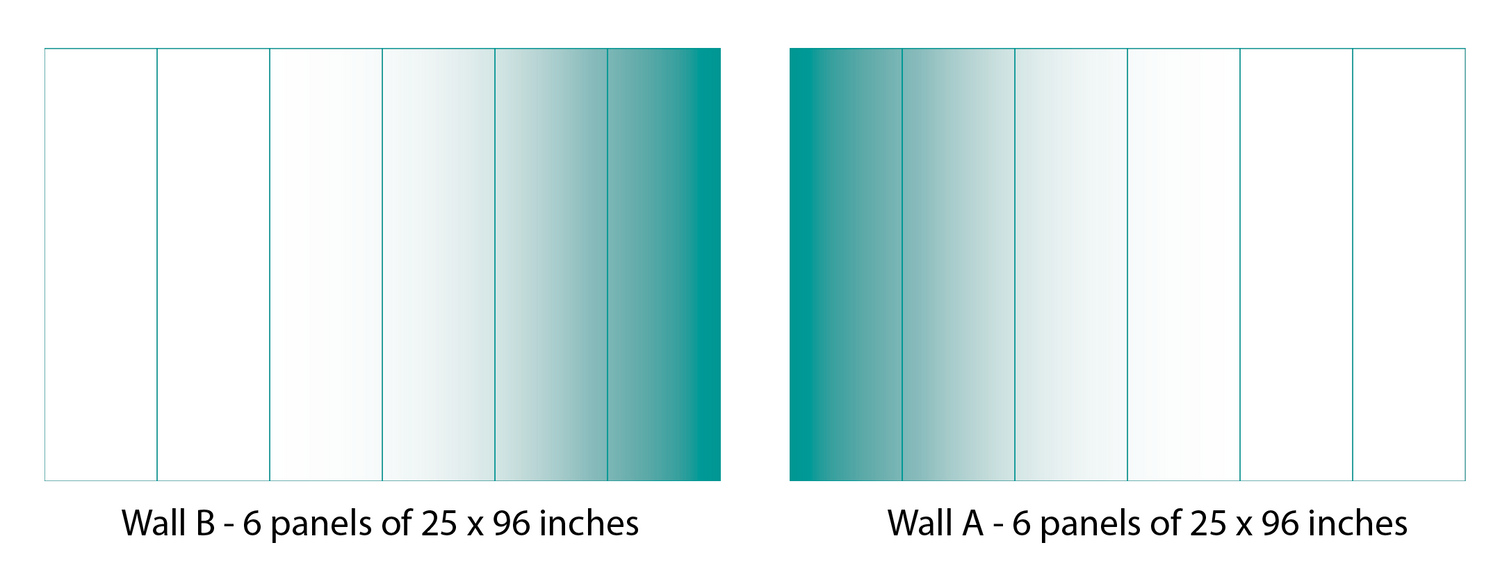 This beautiful gradient ombre fades from Palm Coast Teal to white, panels on wall B travel left to right white to teal and panels on wall A travel right to left teal to white. Walls will mirror each other. Custom color blend will complement and be a close match to Palm Coast by Benjamin Moore paint.