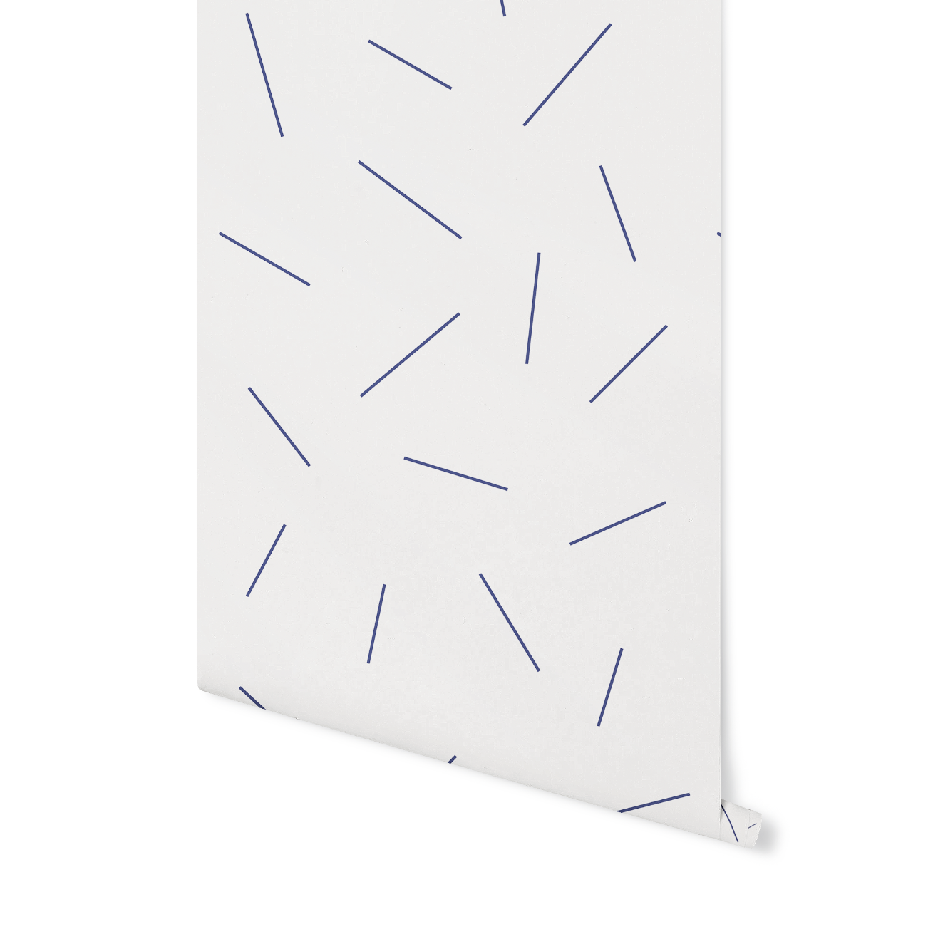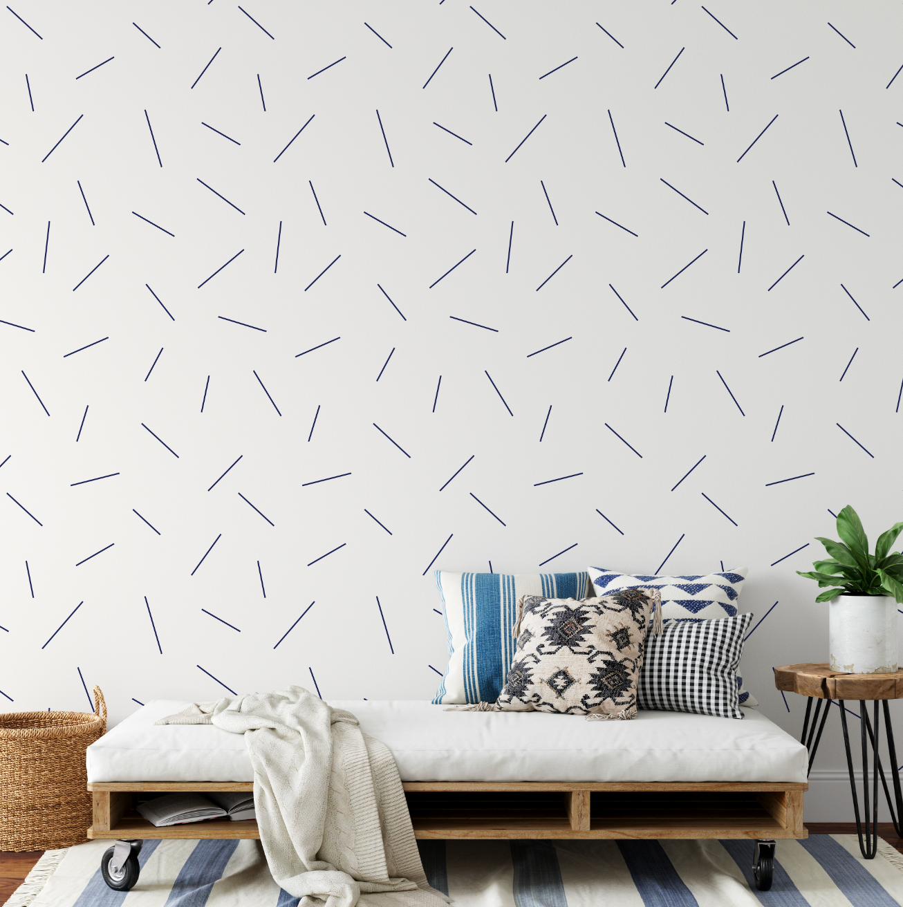 Trendy geometric navy lines at various angles and lengths are featured on an off white background! Navy is PANTONE 2757 C. Ask about custom pattern scale and custom colors. Pattern repeats every 50 inches wide. Seams are all background color which makes lining up seams simple.