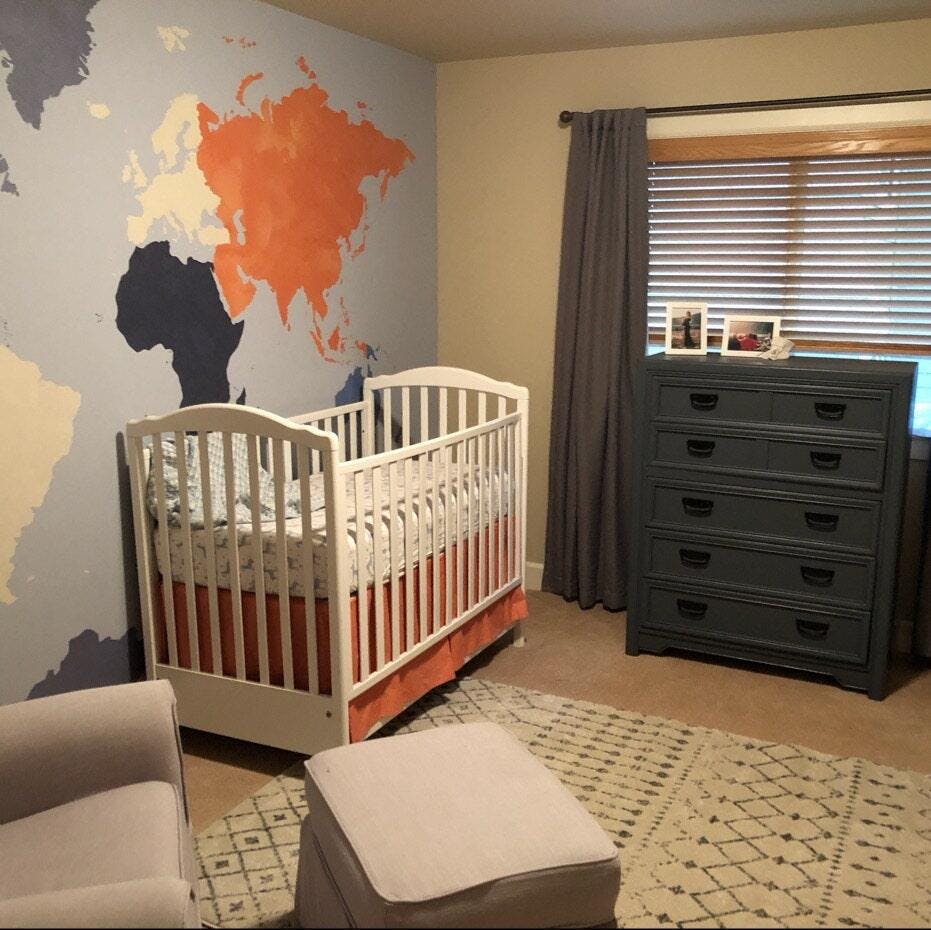 World map colored in with muted oranges, grays and blues with a subtle and artsy watercolor texture. This is a wall mural which will be fit to your wall based on the number and size of panels ordered. Ask about custom color and scale!