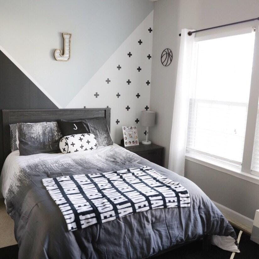 This modern and geometric wall mural features dark gray, light gray, black and white! Whimsical plus signs add additional visual interest! This is a wall mural which will be fit to your wall based on the number and size of panels ordered. Ask about custom color and scale!