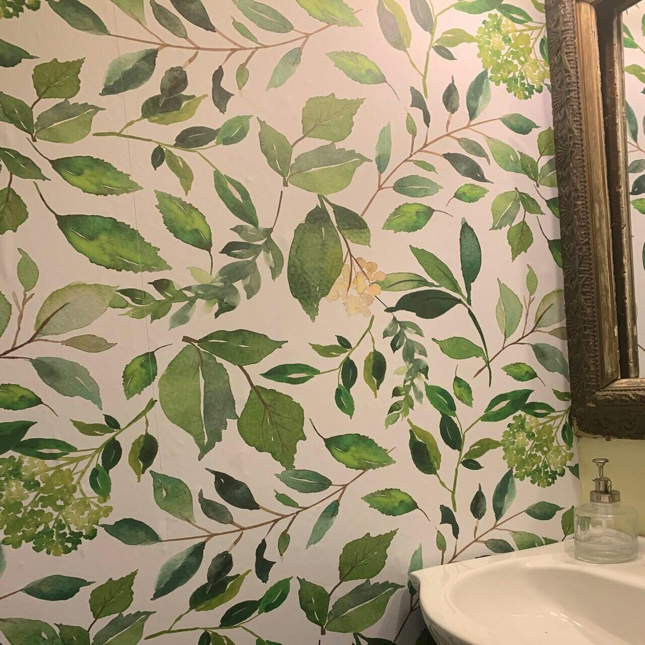 Graceful and elegant green leaves mix with hydrangeas in this floral wallpaper pattern. This pattern repeats every 25 inches wide. Ask about custom colors and scale.