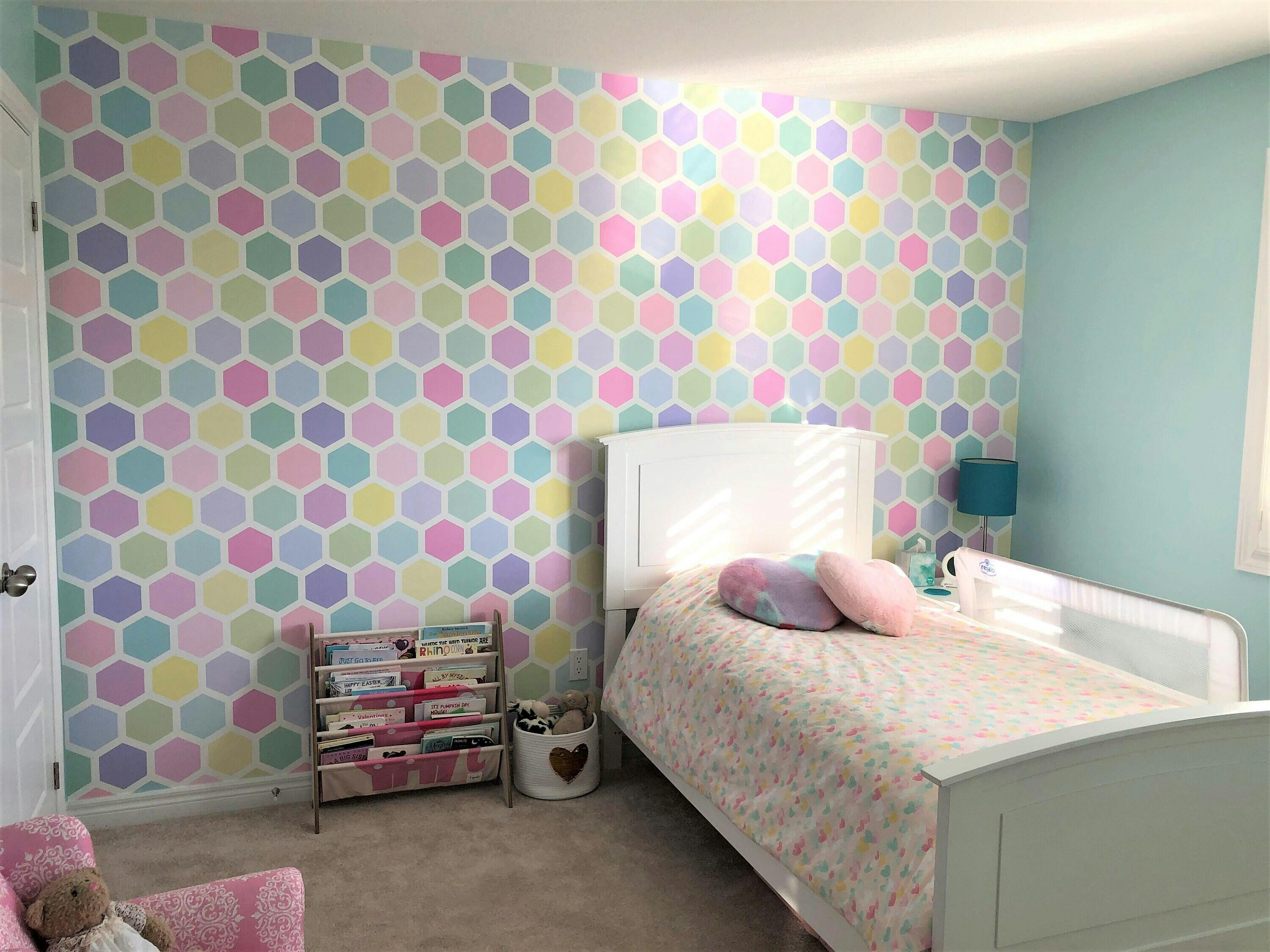 Trendy hexagons feature cheerful colors including green, teal, purple, pink and yellow which were inspired by candy! This pattern repeats every 25 inches wide. Ask about custom colors and scale.