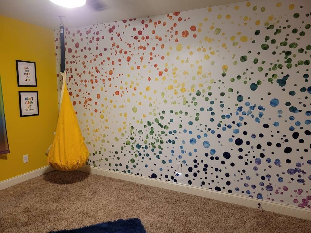 Gorgeous vibrant watercolor free form dots feature classic shades of the rainbow traveling from Red in the upper left hand corner to violet in the lower right hand corner! This wall mural will be custom created to fit perfectly into your space! Request a digital mock up by sending in the width and height of your wall! Each panel will feature a number at the bottom as an install guide. Ask about custom color and scale!