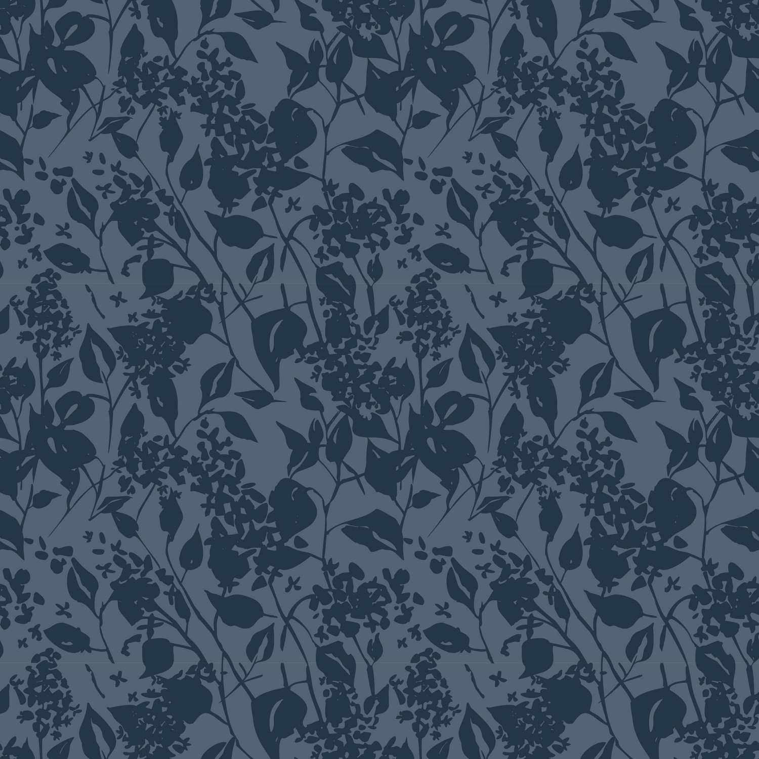This beautiful dark blue wallpaper design features a soft blue background which accentuates a soft navy blue floral silhouette. This wallpaper is considered a modern abstract floral wallpaper design. This dark blue floral wallpaper pattern repeats every 25 inches wide. Ask about custom colors and scale for this navy dark blue floral wallpaper.
